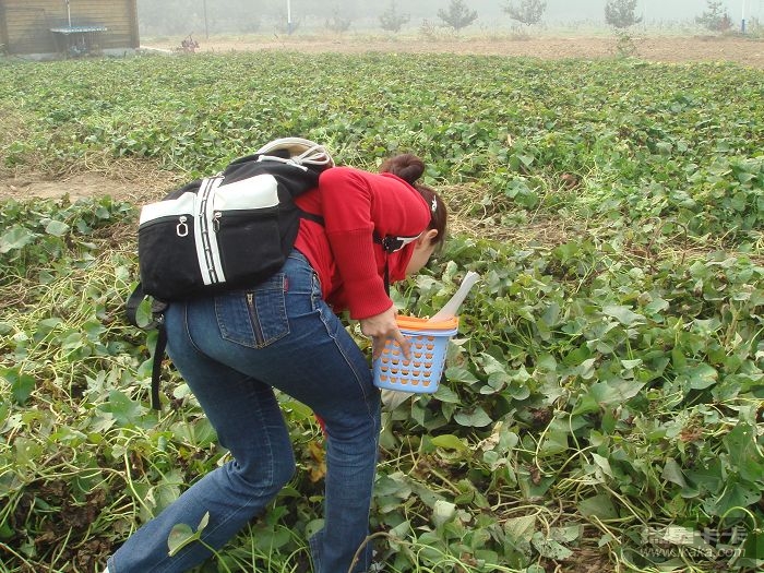 要说这里可采摘的东西还不少,各种水果都有,什么苹果,桃子,李子,栗子,梨啥的,,,不过可惜咱来的不是时候早都过季了,,现在也只能看看果树看看风景了。哎,,赶紧找点当季的东西吧,按照采摘说明,咱七拐八拐的找到了黑花生地。一看,好家伙,那些坐电瓶车的家伙早就到了,正在花生地里刨的不亦乐乎,一片花生地基本被翻个底朝天了。这时,俺身后的妹子拉了俺一下,用幽怨的眼神看了看俺,又看了看筐子,,啥也别说了,哥明白了! 赶紧下车抢去吧,再晚点估计花生皮都摸不到了。哥为了妹子,使用了超级赛亚人8级变身,以迅雷不及掩耳到铃儿响叮当之势冲了出去。。。。。。。