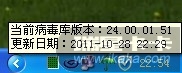 图十:桌面右下角鼠标放到小绿伞处,显示的为“当前病毒库版本”及“更新日期”。病毒库从2011-10-10 6:00更新到2011-10-28 22:29,但是,大家看到没有,病毒库的版本号与下图的程序版本号是一致的,2012没有了程序版本号的升级提示???