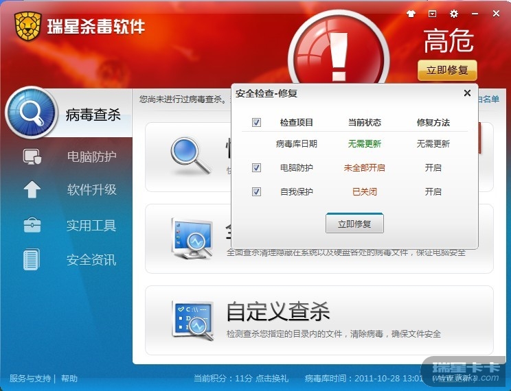图二:安全检查-修复。是不可以的,很可能瑞星现在还不稳定,所以锁定了不太开启监控及查杀。
