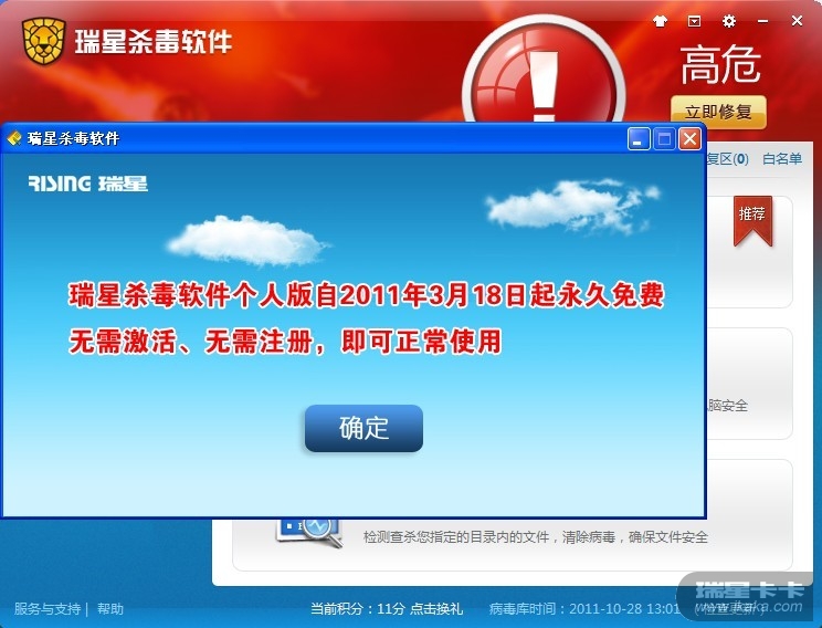 瑞星完全免费后不需要激活,2012版的瑞星取消了“软件激活”按钮,听取了我的建议。哈哈哈,臭美。