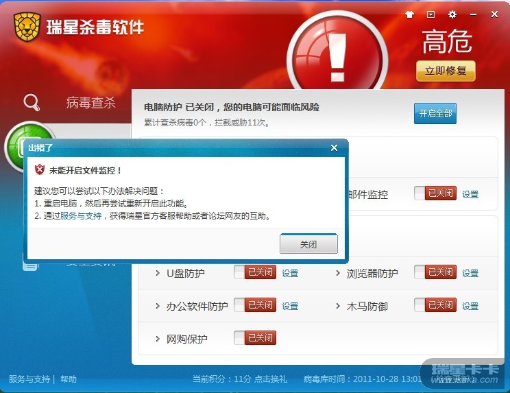 目前,瑞星杀毒软件2012无法开启任何监控,但是,却一点不卡了,原来前一版本在关闭所有监控的情况下还是相当的卡。