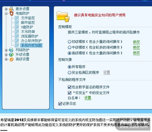 希望瑞星2012及后续版本都能够保留可自定义的系统内核主防加固