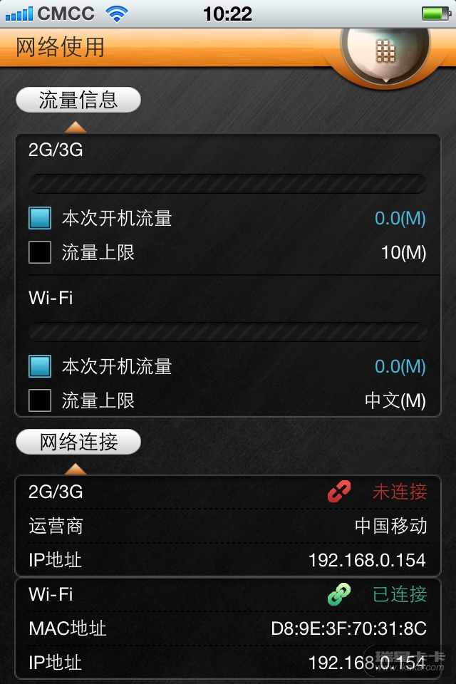 出现问题前的操作步骤:打开iphone版手机助手,选择网络使用页面,双击流量上限进行设置,可以填写中文,设置成中文后切换其他页面返回后流量上限被修改为0M