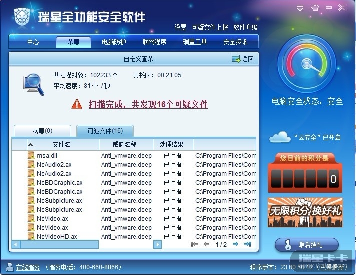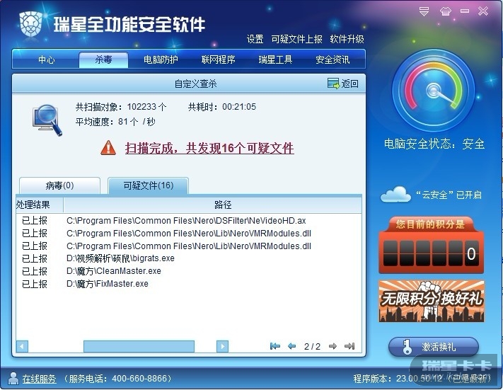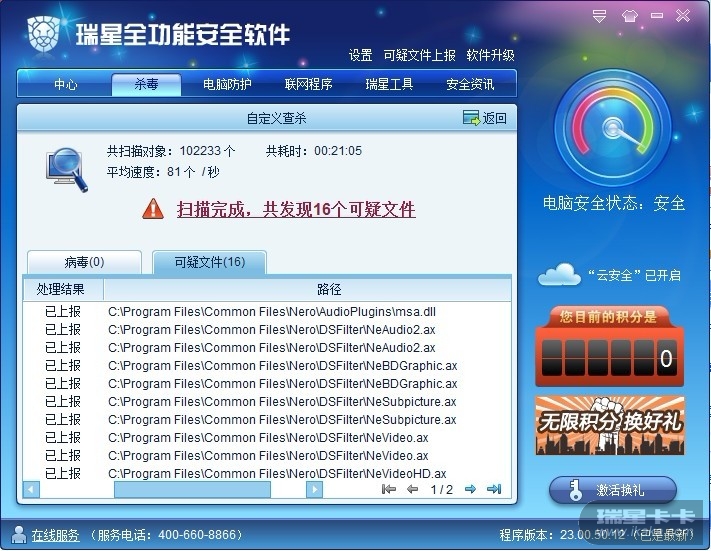 2011年1月份买的电脑,当时光驱配有OEM版Nero刻录软件,装好系统立即用瑞星全功能安全软件全盘扫描,来了...一连串的可疑文件滚滚而来,仔细一看全是Nero软件的,软件已自动上报了。