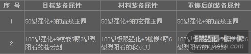 3)点击“重铸”按钮,重铸的成功几率为100%,重铸后材料装备消失。材料装备的强化等级、精炼加成比例、宝石镶嵌效果、古玉效果全部覆盖至目标装备。
