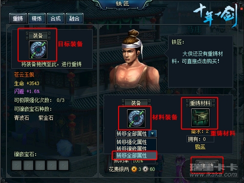 强化、镶嵌、属性宝石、精炼、赤炼、古玉效果都可经过重铸-全部属性转移覆盖到目标装备上。
