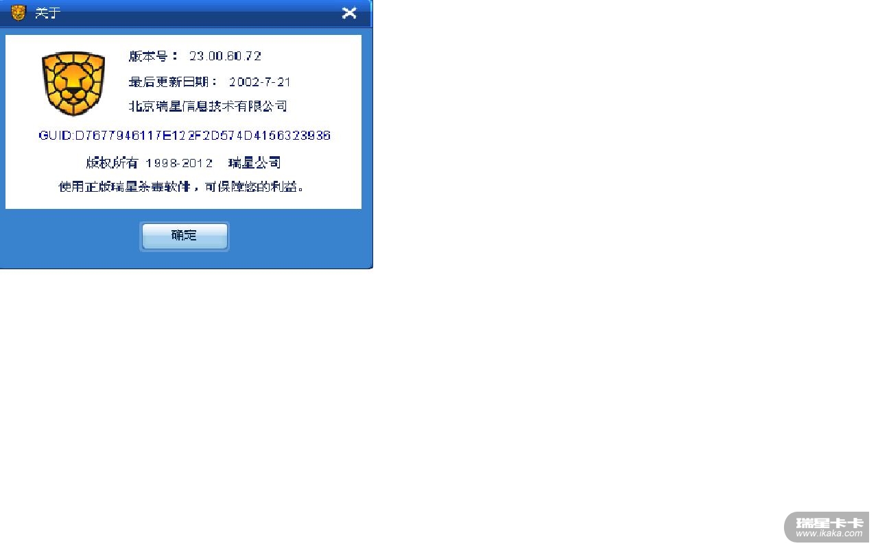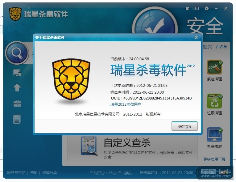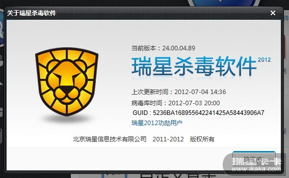 下载2012版瑞星杀毒软件安装使用,并将其GUID截图跟帖发来。