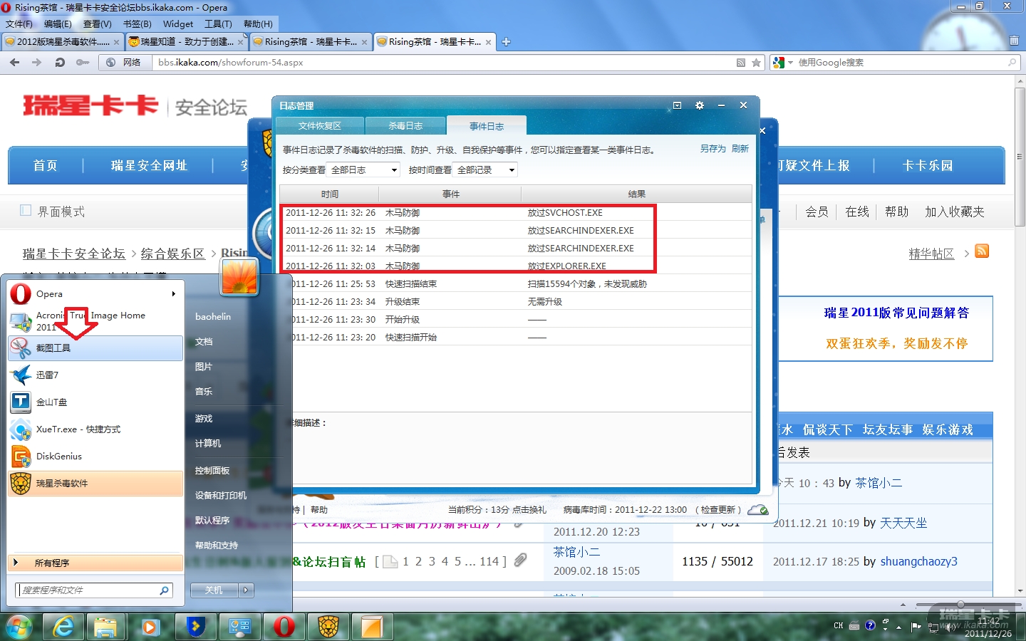 启用WIN7 截图工具时,RAV木马防御报警。选择“放过”(见附图)。