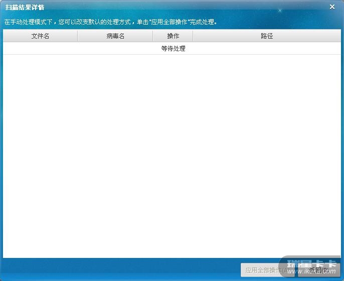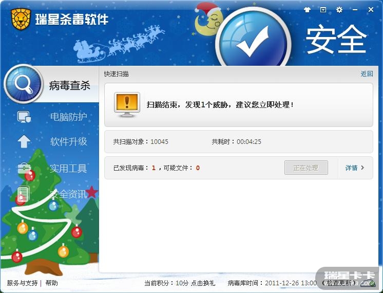 刚刚打开瑞星主界面,停留一段时间,瑞星提示:扫描结束,发现1个威胁,建议您立即处理!这时候我选择“清除病毒”,结果瑞星就卡在“正在处理”的状态,无任何反应。我点击详情,里面也是空空如也,没有显示这个威胁是什么文件,只显示了“等待处理”字样。于是,我准备强行退出瑞星,它却提示“病毒尚未处理完毕,问我如何处理”,如果我选择“清除病毒”,那么前面的这些步骤会重复进行,进入“死循环”。所以,我只好选择“不处理”,瑞星主界面才能够退出。具体原因不明。