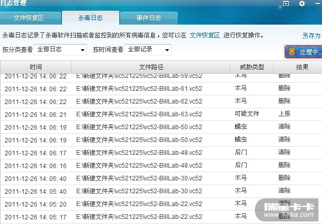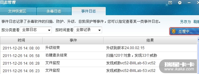 1、界面显示隔离区34,右键查杀条显示已处理30,待处理3 2、右键查杀条没关闭按钮。