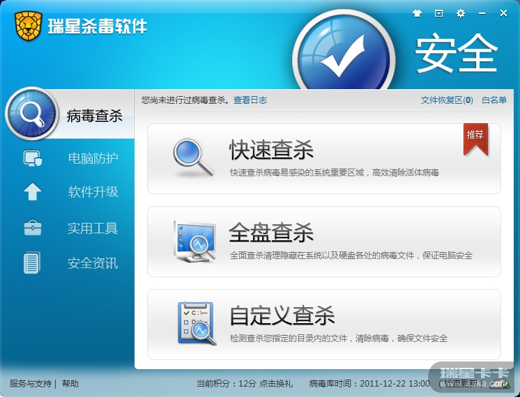 第一次打开瑞星杀毒软件2012的界面,真得感到惊讶。因为与之前两年的界面相比,这次的界面改动是最大的!此次瑞星放弃了多年采用的横向标签页的布局方式,而是将主要的功能以纵向的方式排列,使人感到耳目一新。此外,瑞星将安检的功能通过一个球形按钮来显示,确实有些新意。在病毒查杀界面,瑞星依旧采用三种查杀方式,“快速查杀”、“全盘查杀”、“自定义查杀”。