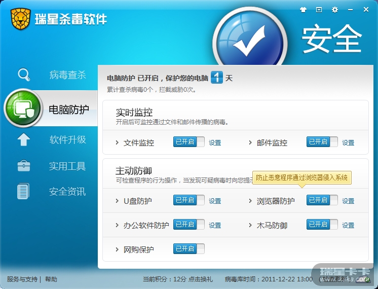 瑞星杀毒软件2012在电脑防护方面,与2011版相比,有所变化。实时监控依旧分为“文件监控”和“邮件监控”。但是,主动防御却少了“系统加固”。笔者认为,这与瑞星杀毒软件2012版的定位有关。2012版更加强调“智能”、“轻”、“快”。“系统加固”这个功能虽然在专业用户眼里是个非常不错的功能,但是普通用户却并不一定这样认为。有些用户会对“系统加固”的提示感到无所适从。相信通过更加智能的“木马防御”、“浏览器防护”等其他功能,能够一定程度上弥补安全性上的损失。“网购保护”是瑞星杀毒软件2012新增的一项功能。令笔者感到奇怪的是,虽然开启了网购保护,但是登录淘宝等网购网站,瑞星却没有任何提示。作为一项新增的功能,笔者认为还是有必要进行适当的提示。提示的方式可以是弹出提示框、监控图标的变化、浏览器地址栏上出现“网购保护”的图标等。