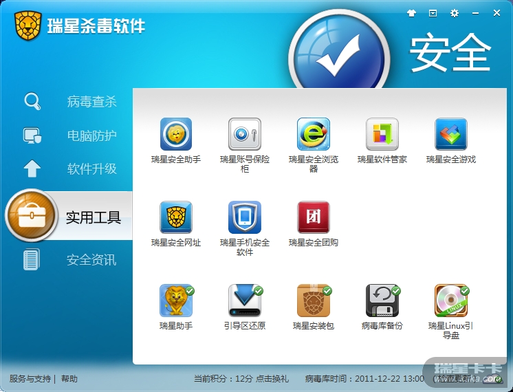 从瑞星杀毒软件2012的“实用工具”界面可以看出,经过这一年的努力,瑞星的产品越来越丰富。