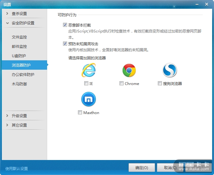 瑞星杀毒软件2012的设置界面更加简洁。笔者发现一处问题,即默认情况下,“需加固的浏览器”、“需加固的办公软件”都未被选择。假如用户没有注意设置,那么将失去这方面的保护。