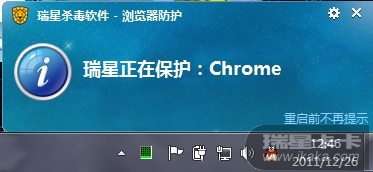 瑞星杀毒软件2012的浏览器防护提示,较上一个版本而言,有所改进。但是,笔者仍然发现一个问题。即这个提示框是在浏览器进程创建时弹出,那么当用户在打开浏览器浏览时,每打开一个选项卡,瑞星都会弹出这样一个提示。原本温馨的提示,由于频度过高,就会使用户感到厌烦,虽然有一个“重启之前不再提示”的选项,但是个人认为应该改为第一次打开浏览器时弹出提示框,而不是每打开一个选项卡就弹出提示框。在设置中,应该有相关选项关闭这个提示。