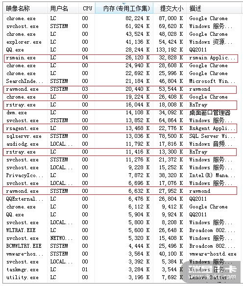 上图是瑞星杀毒软件2012在执行查杀时的资源占有表现。由于同时安装了杀毒软件和防火墙,所以出现了两个ravmond.exe和rstray.exe。由于仍是beta版,因此资源占有仍然不是很理想。在查杀的过程中,浏览网页和聊QQ均存在一定的延时。
