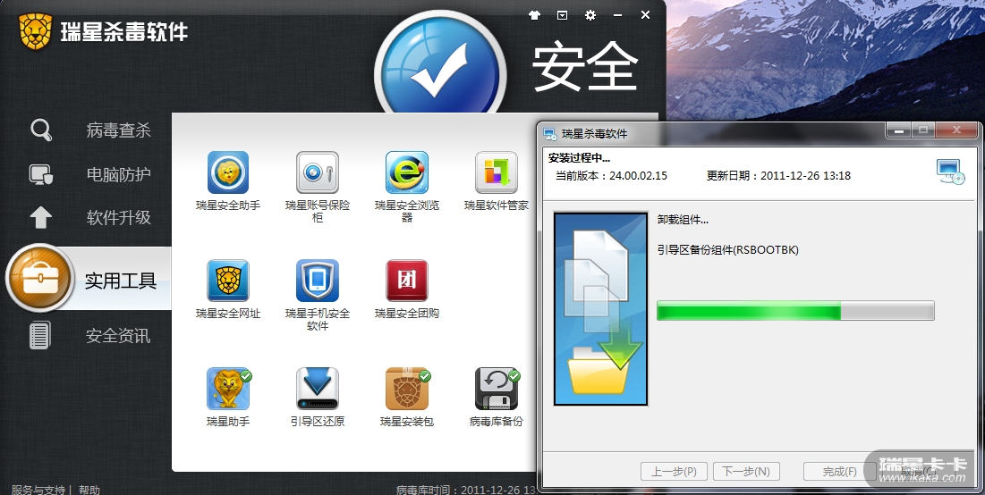 在安装瑞星杀毒软件2012之后,从开始菜单卸载“引导区还原组件”,卸载过程卡在上图所示位置,但是,主界面中已经显示组件已被卸载。