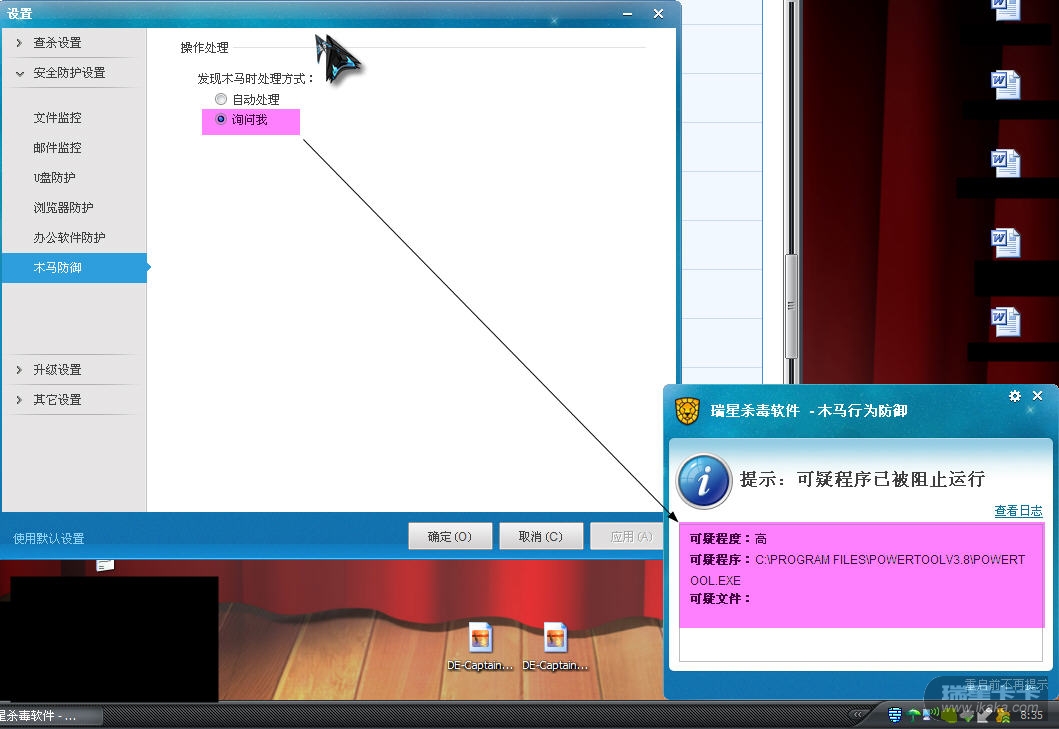 其次我在木马防御已经选择询问的选项,但是防御依旧会自动阻止