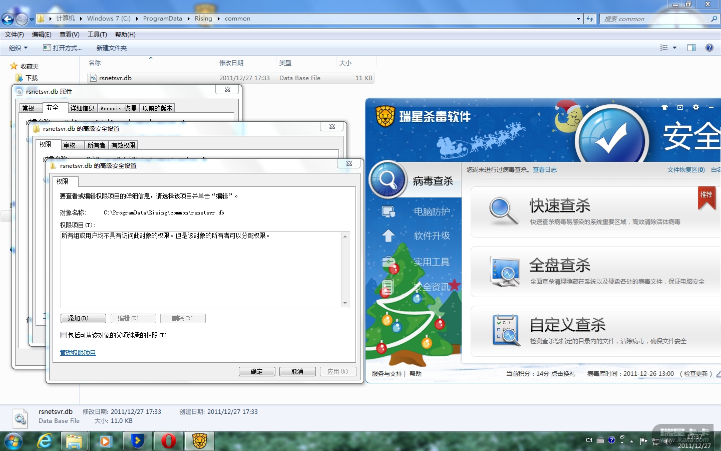 刚才,开着RAV2012所有监控,又恶搞了一下这个目录下的C:\ProgramData\Rising\common\rsnetsvr.db(取消所有权限)