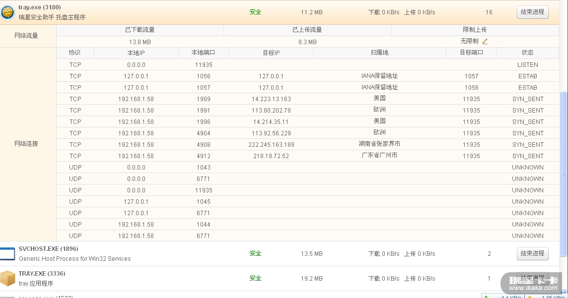 另外,本人看了自己的联网程序,关于瑞星的Rsleak.exe、tray.exe等正在实时运行的软件,在我关闭IE及其它软件的情况下,其归属地,在不到1秒的时间就不停地变换,不是美国就是欧洲,要不就是在中国的不同省份的不同城市不停地变换,详见下面几幅图片,另外,本人关闭了瑞星系列软件后,IE上网正常,速度飞快!!!请瑞星工程师给个解释啊。