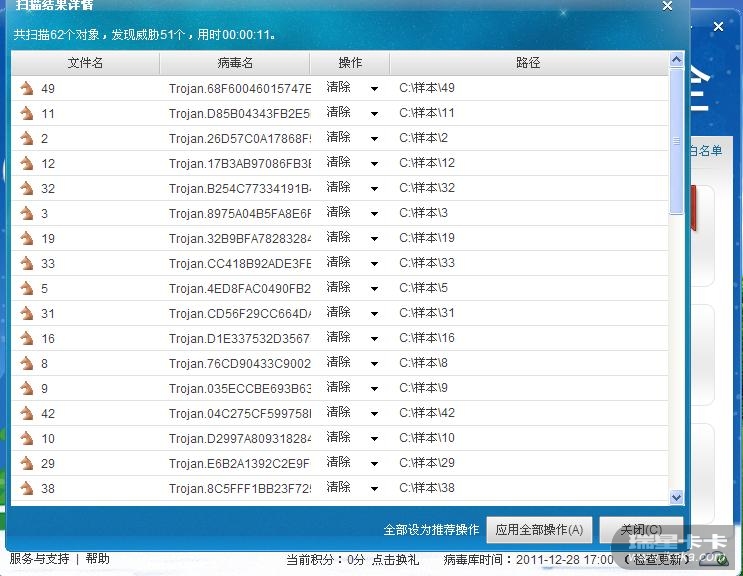 扫描删除了50个,查杀率50/60=83.3%,很不错的成绩!