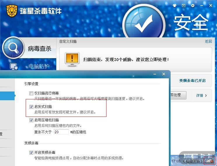 修复后瑞星做联网扫描,结果多发现了1个,证明了云的存在,主要是因为样本少和病毒库的影响所以查杀率提升不是很明显,查杀率51/60=85%