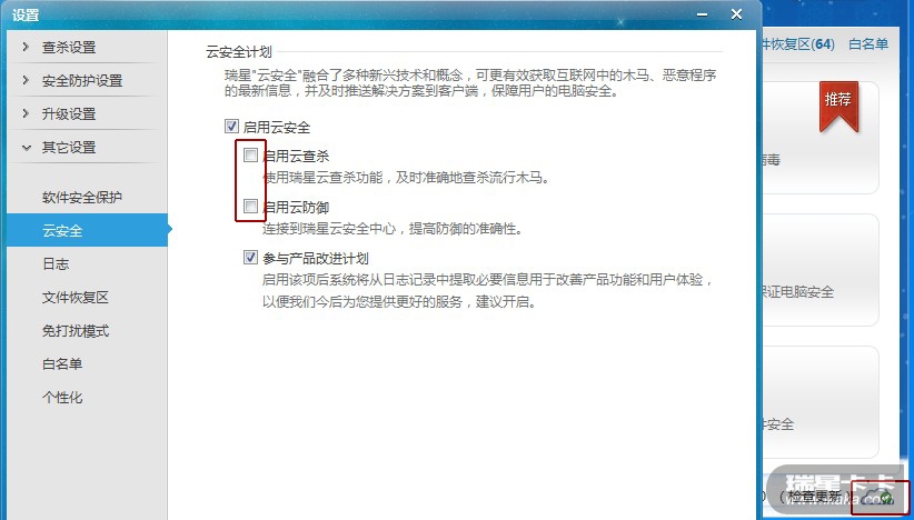打开瑞星杀毒软件,详细设置——>其它设置——>云安全,在启用云安全下的,“启用云查杀”和“启用云防御”去掉前面的选勾后,瑞星主界面右下角的云安全还是打着启用的绿色勾(如图1),我觉的把,云安全中主要的“启用云查杀”和“启用云防御”没有选择时,瑞星主界面的云安全是不是应该改为禁用标记(如图2),