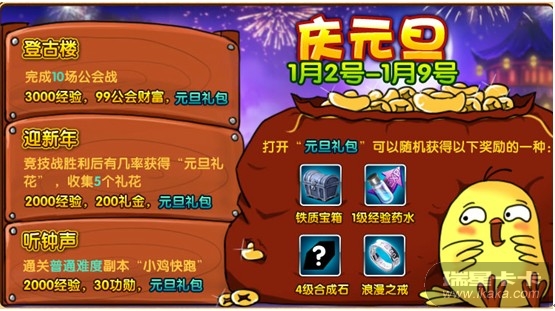 庆祝新年到来的活动也不会少。1月1日到1月9日,《弹弹堂》特别推出登古楼、听钟声、迎新年三大辞旧迎新活动,丰厚的元旦礼包、大量的功勋、经验、财富、礼金,都等着弹友们来领取。