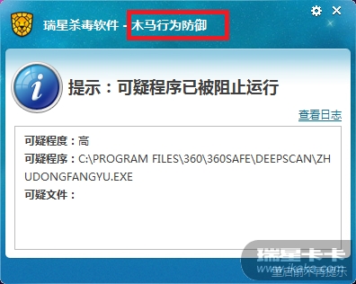 安装360安全卫士过程中,瑞星杀毒软件2012的木马防御进行了拦截。另外,这个提示框中的“木马行为防御”多了两个字“行为”,主界面中该功能名称为“木马防御”。
