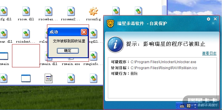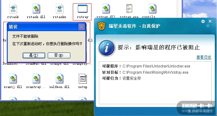 在VMWare虚拟机,Windows XP SP3系统,使用unlocker强制删除瑞星文件夹内的部分文件的测试: