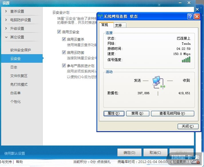 云状态是断开,但我查看了软件设置的“云安全”,确认各项功能都已经打开。同时宽带也是正常连接状态。此时,我点击一下右下角的云图标,又恢复成绿色了。建议:增加云状态自动检测功能。