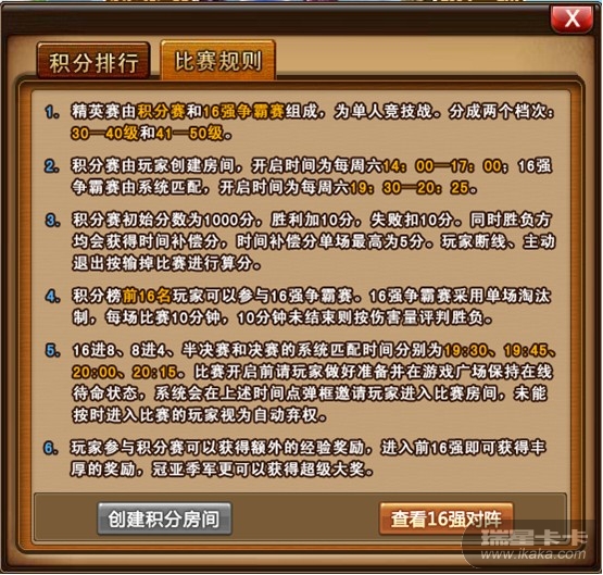 点击“更多”按钮,打开精英赛界面即可查看积分排行及比赛规则。精英赛开启时间为每周六14:00-17:00。只有在精英赛开启时才能创建积分房间。