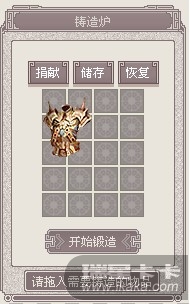 活动内容:服务器维护更新后,玩家即可在铸造屋中看到“储存”和“恢复”,玩家可以将紫装当前属性保存,并在需要的时候点击“恢复”来将该紫装属性恢复,保证您的紫装拥有合适的属性,洗炼再无后顾之忧。