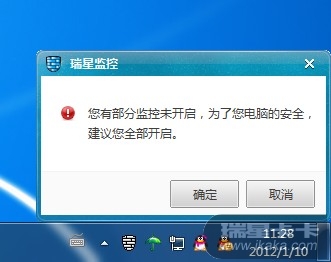 在系统托盘处右键退出防火墙监控后,再在开始菜单,打开防火墙监控中心时,系统托盘处弹出防火墙监控提示“您有部分监控未开启,为了您电脑的安全,建议您全部开启。(如图)”可是我在设置中查看,防火墙中所有监控都开启了,却还有这个提示,