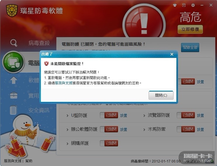 我重啟電腦都不能開啟瑞星殺毒軟件2012的電腦保護呢~?!