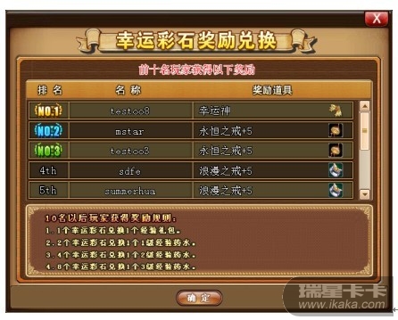 活动结束后系统将弹出“幸运彩石奖励兑换“列表,弹友可查看前十排名和奖励物品。奖励在活动结束后将通过邮件发送给各弹友
