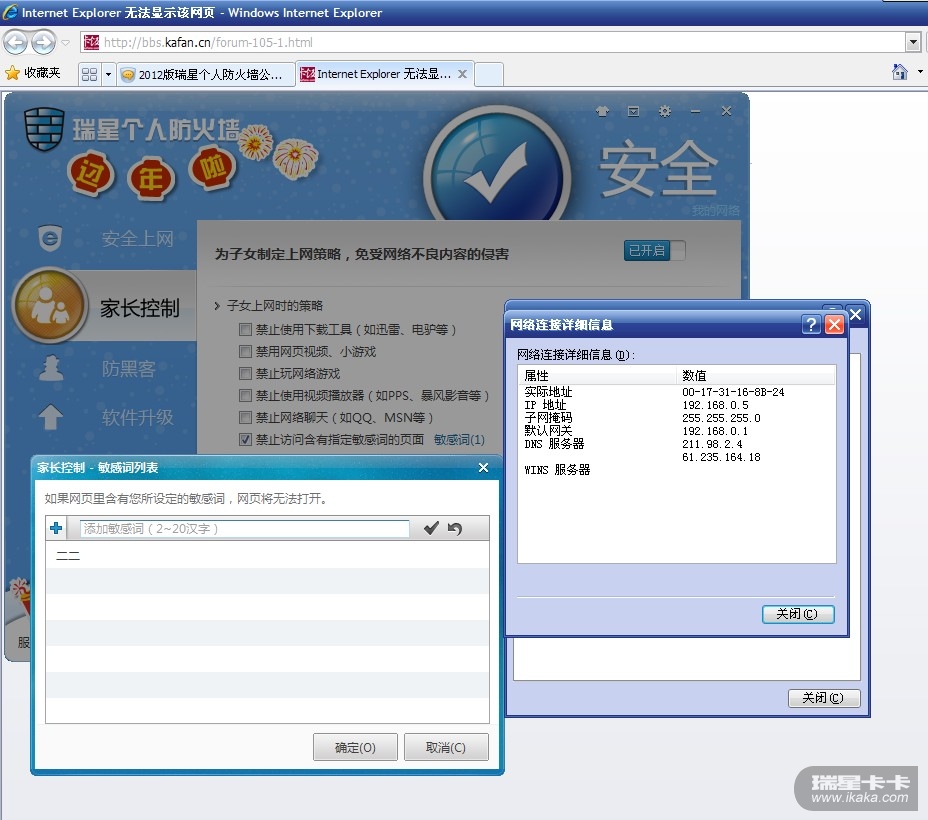 瑞星卡卡安全论坛个人产品讨论区瑞星个人防火墙V16 【BUG】家长控制敏感词和地方DNS冲突导致小部分网站无法访问