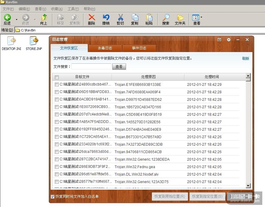 4、目前瑞星隔离区的文件信息是从生成的数据库文件信息中读取,而以前直接从ravbin中读取文件内信息的。尽管目前瑞星对RAVBIN文件夹也进行了保护。但之前的方法为什么不采用呢?下图中已经删除了ravbin下面的隔离文件,但是打开隔离区还是能看到文件信息。