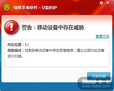 当插上U盘,以瑞星的默认设置,会首先发现U盘内的可执行病毒文件,