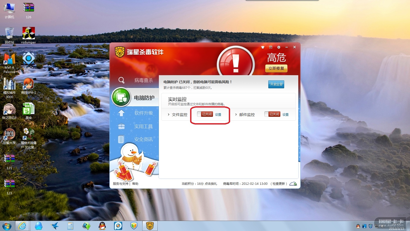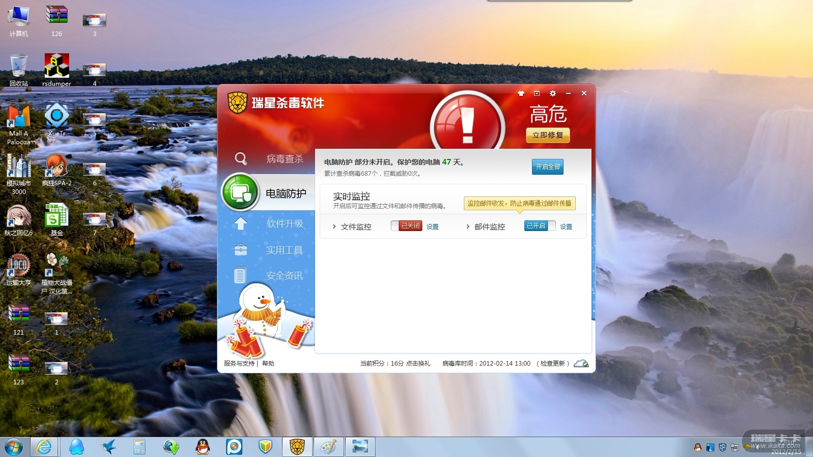 测试C,杀毒软件开启主程序后退出托盘(托盘状态为文件监控关闭、邮件监控打开,黄伞)
