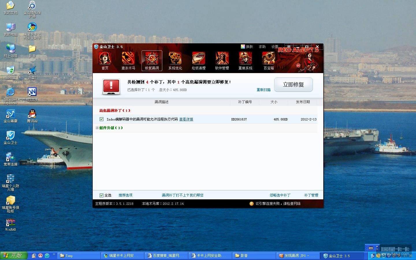 原来试装过瑞星安全助手但是和系统及一些软件冲突,并且居然没有卸载选项(我装了几次都没有卸载项,几个月后重装还是一样,每次都是重装几遍才出来卸载项,用不了这么麻烦的),所以至今依然选择卡卡,因为卡卡的打补丁和删除垃圾文件功能还行,不过这次也打不了这个补丁了,咋回事呢???