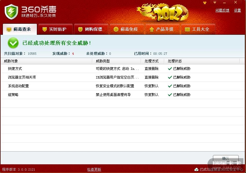 同一个新安装的虚拟机系统,瑞星2012扫描后无威胁: