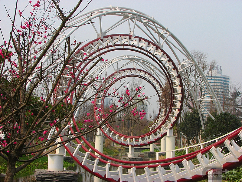 这是最近在成都东郊刚开园不久的成华公园拍的一组红梅。公园原是游乐园改建,其中的过山车被留了部分作景观,我见那里刚好有株红梅树,便以此为背景拍了几张