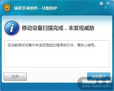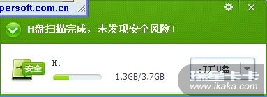 扫描完成后和瑞星的基本相同,但有U盘容量鉴定并且上方有绿色显示,U盘信息及U盘内文件的安全性一目了然,还有专门设计的安
