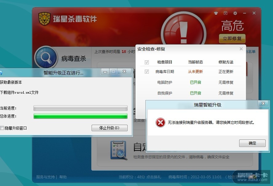 win8消费者预览版,瑞星所有软件无法升级,杀毒软件2012公测版、个人防火墙2012公测版、瑞星安全助手,都显示无法连接到瑞星升级服务器