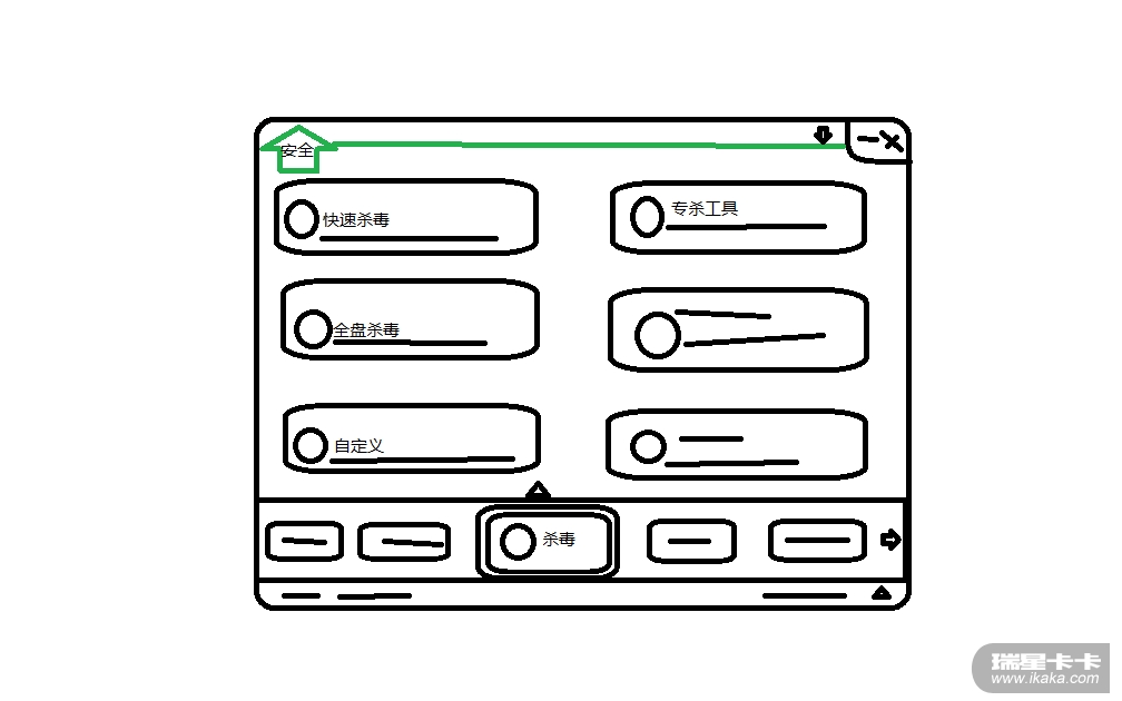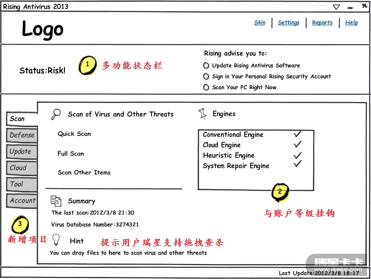 对于本次“征集针对2012产品UI设计的建议”的活动,作为星迷,当然要顶力支持啦!其实,之前已经发过的帖子当中,也谈了不少UI。今天,看到瑞星工程师12的帖子,不禁又做了一次头脑风暴,综合了TOM兄的建议,结合自己对理想界面的期待,花了一个晚上做出了这幅草图,本来打算再画几张,来更完整地表述我的想法,由于寝室会断网,姑且就先画一张吧,没时间画的几张草图就代由文字来表述。