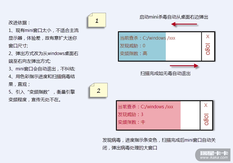 界面其实很简单 向着简单的方向去发展就可以了 简单 易用尽可能的减少鼠标的点击 更换皮肤 和现在的2012一样 就是更换背景 同理 如果没升级病毒库等等的时候 界面会变红 既然有界面颜色做状态特征 那些对号什么的 就不必添加了
