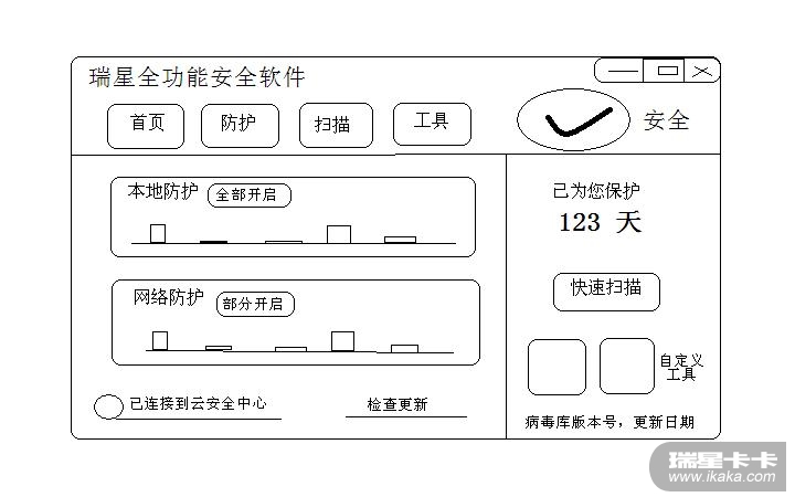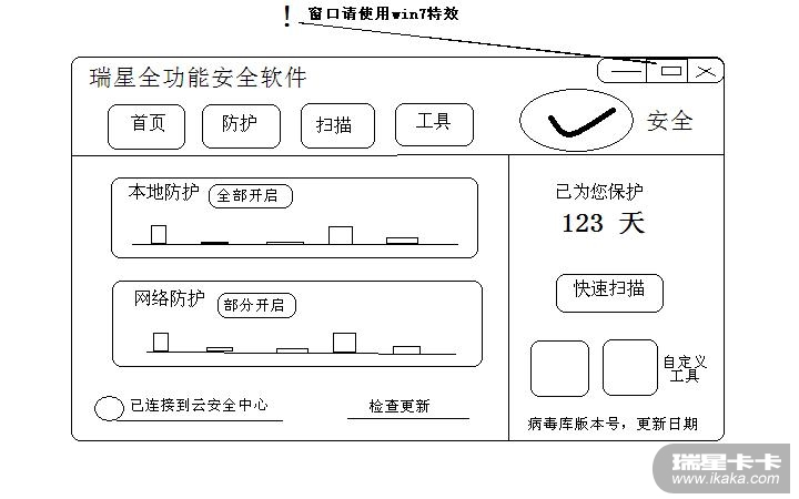 采用鲜明的颜色,对按钮做出柔和化处理,选择合适的图标大小,详细的进程介绍,准确的后续操作判断,提示框采用多种亮色,并且按钮立体化,颜色最好采用阳光、绿色的颜色,自然地颜色,相信用户都不会怎么抵触。病毒、木马、加固等提供等级评判,适量的假如图标动态效果。升级提示升级的是病毒库还是木马防御。让用户清楚自己更新的是什么。我不会设计UI,就是类似30楼和24楼的
