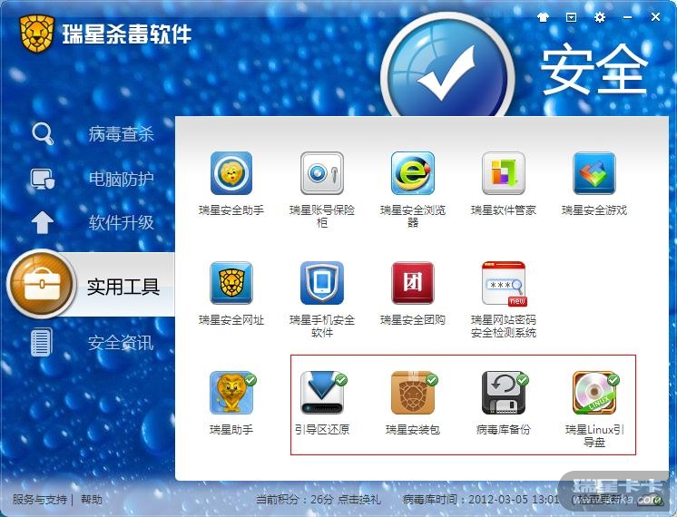 另外建议将瑞星卡卡中的一些实用功能如系统修复、漏洞修复等等也加进来,既然2012版加了实用工具这个功能就应该把它做好!