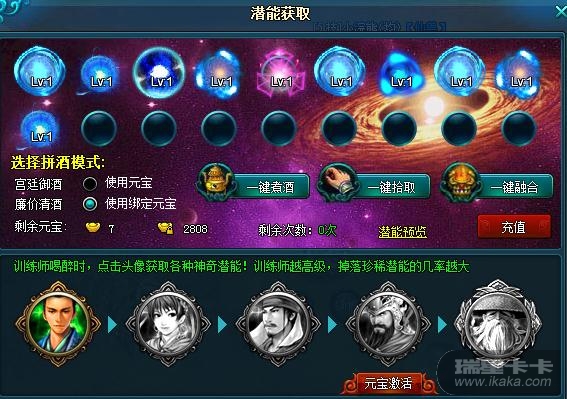 )玩家可以选择使用元宝或者绑定元宝进行拼酒,拼酒时,有可能点亮高级训练师,训练师越高级,获得珍稀潜能的机会越大